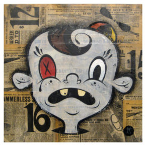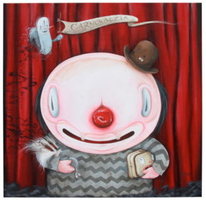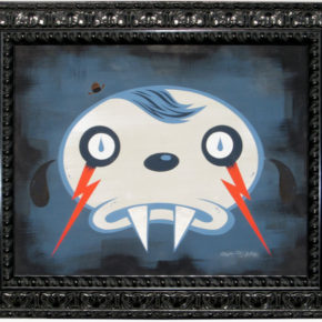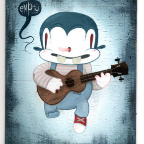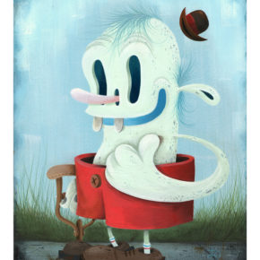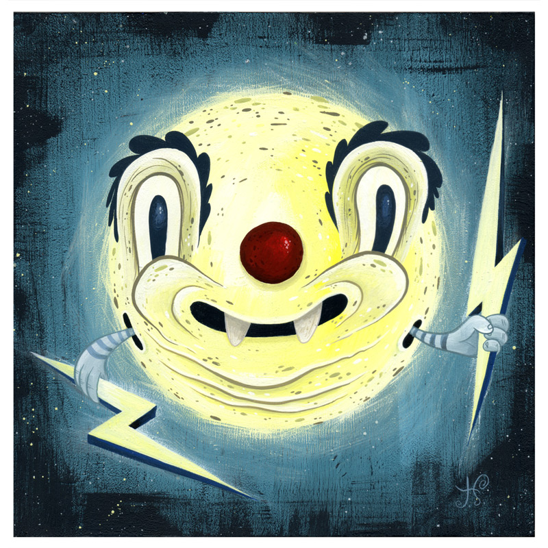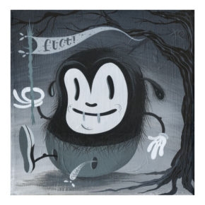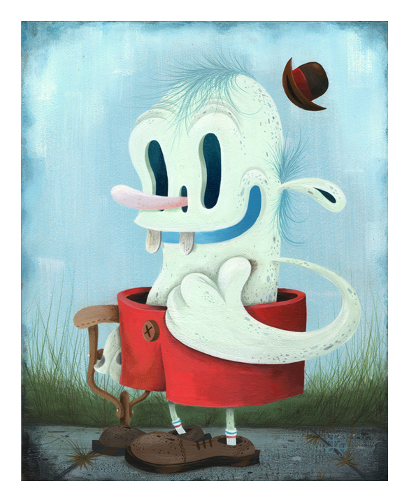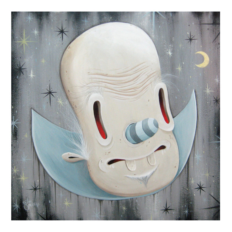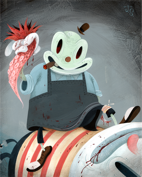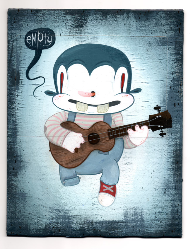 During the day Joe works as an online art director for a non-profit consumer advocacy group. He spends his nights painting characters and environments that recall the odd early days of animation and the dingy despair of the 1930′s. With their popsicle stick bucktoothed grins, hollow heads and dead eyes his characters often straddle the lines between funny, tragic, grotesque, and sad.