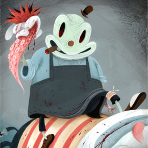 Joe: As a kid I loved Popeye, Woody woodpecker, Tom & jerry… all the classics. Just about anything by Tex Avery! I grew up expecting cars to come equipped with miniature 1940’s pin-up gals in the glove box. Max Fleischer, I remember seeing Steamboat Willie at a young age and being fascinated by it… it all looked so strange. A lot of the early animation from the 20’s and 30’s definitely inspires my work now. It’s all very surreal and psychotically happy.