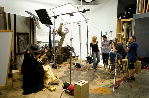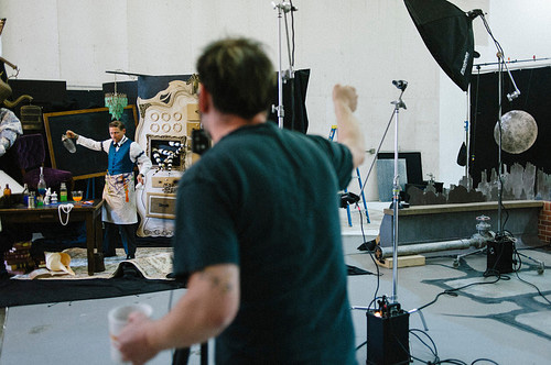 I tend to be a bit of a hermit, and even though I lived in San Francisco I didn’t make it to as many art shows as I would have liked. If I remember correctly Stacey Ransom contacted me, stating that she had been a fan of the site for quite some time. Coincidentally Stacey has her own art blog entitled Ransom Notes that I have read on many an occasion. I was excited to act as a fly on the wall, and see how this dynamic duo worked to create these images. I am no slouch myself when it comes to photoshop, and am a big fan of photography, so this seemed like a great chance to observe as well as learn. However, it is days like this when you learn, maybe you aren’t as good at photoshop or photography as you thought. While Jason Mitchell is the photographer/director, and Stacey Ransom is the set designer and photo-illustrator, there is a also big team that goes into these shoots. Make-up, assistants for set design, assistants for lighting, etc. I think in this age of people using photoshop, people tend to think that many simply shoot photos, make sure they are ok, and then go into photoshop and make them better. That is not the case here, and I was very happy to see that even though Stacy is an expert level user of photoshop, what you think might be digital illustration in the images, is in fact part of the set, or part of the costume. It was very clear shortly after I arrived, that the goal of Ransom & Mitchell, is achieve a high level of production from beginning to end.