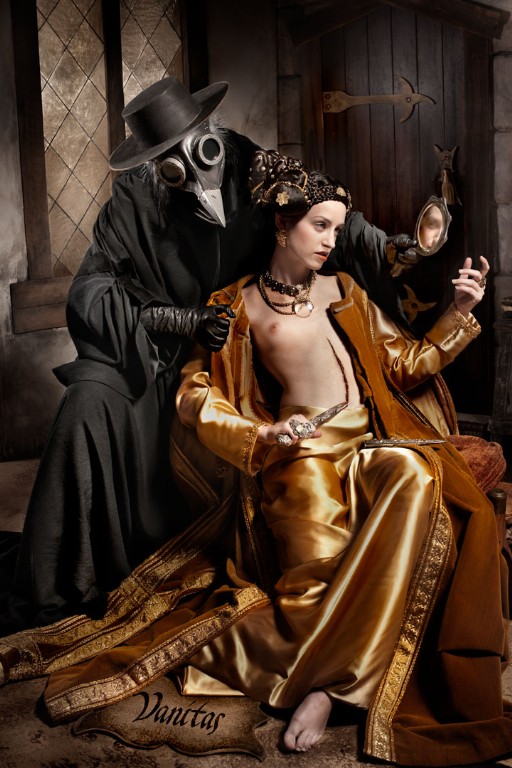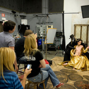 When I first showed up on the set I met Stacey and Jason for the first time, both very nice, and the crew was happy and very excited to be working on these shoots. Luckily for me there was a great spread of food, which was good since I didn’t eat. When I walked into the set I could see two separate setups, and after an explanation by Stacey, these two sets would soon become one in the final image. Lighting equipment surrounded the area, and Scott Musgrove was being prepared, make-up and costume, for the beginning of the shoot. Stacey took me on a tour of the studio, which included the offices upstairs and a small museum in progress of artifacts, costumes, and accessories that have been featured in previous shoots.