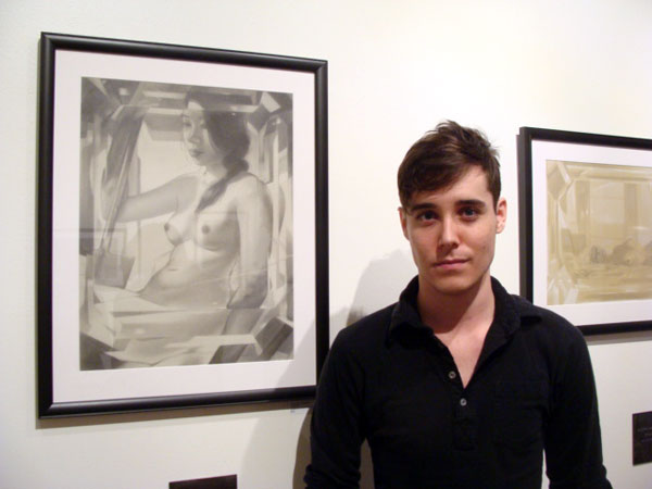 I have always been attracted to figurative works, so I was especially taken in with the way that Sam handled the media in which the works were comprised of. He said that he chooses what materials he is going to use based on what effect he wants. So if the goal is a particularly moody piece, such as Alex (shown below), he will use graphite on paper and really build up that sfumato. The drawings have this amazing smokey quality to them, you will find no harsh lines in these works. I don’t want to say the way in which he applied the graphite is painterly, it seems more related to photography, in which the works have this grainy feel to them and almost a vignette around the border.