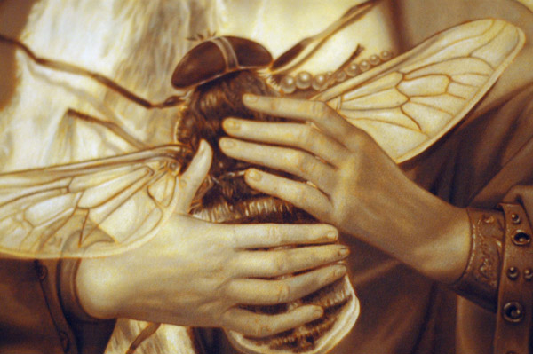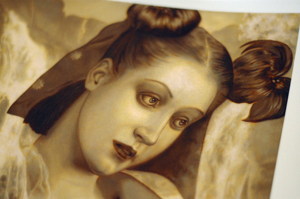The print is shipped rolled in a heavy duty tube, even with some padding on both ends to protect it. The quality of the print is outstanding. The paper is heavy/durable and has just a little bit of tooth to it that is really only noticeable if you touch it. While the image is done in the style of a Flemish underpainting, I think the choice to not print onto canvas was a good idea. As you can see in the first photo there are little touches of burnt sienna showing through, but this was taken with a flash. The photos after were taken with natural light and now you can see the print is pretty much flooded with burnt sienna. It’s a very unique effect and for me only adds to vibe of an already impressive piece of art.